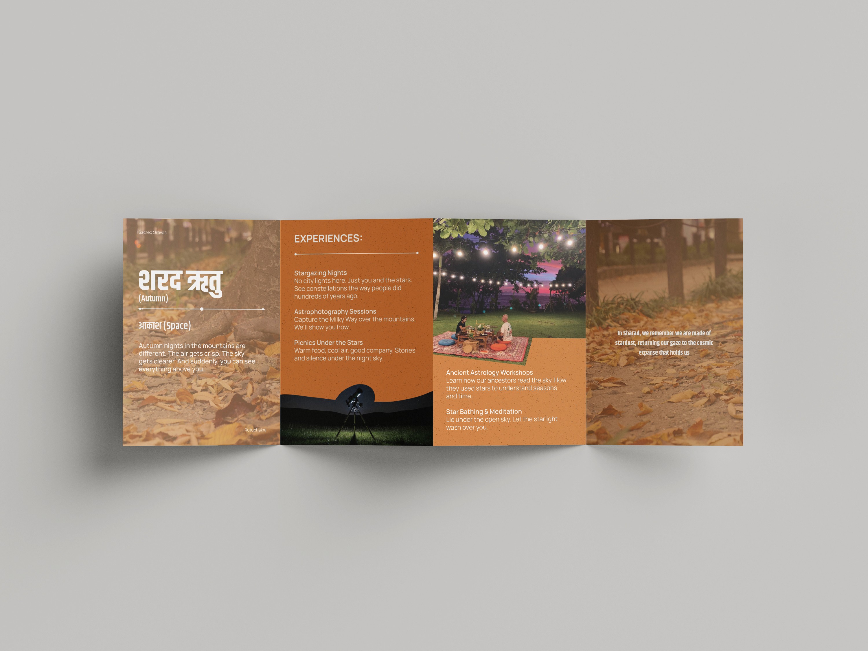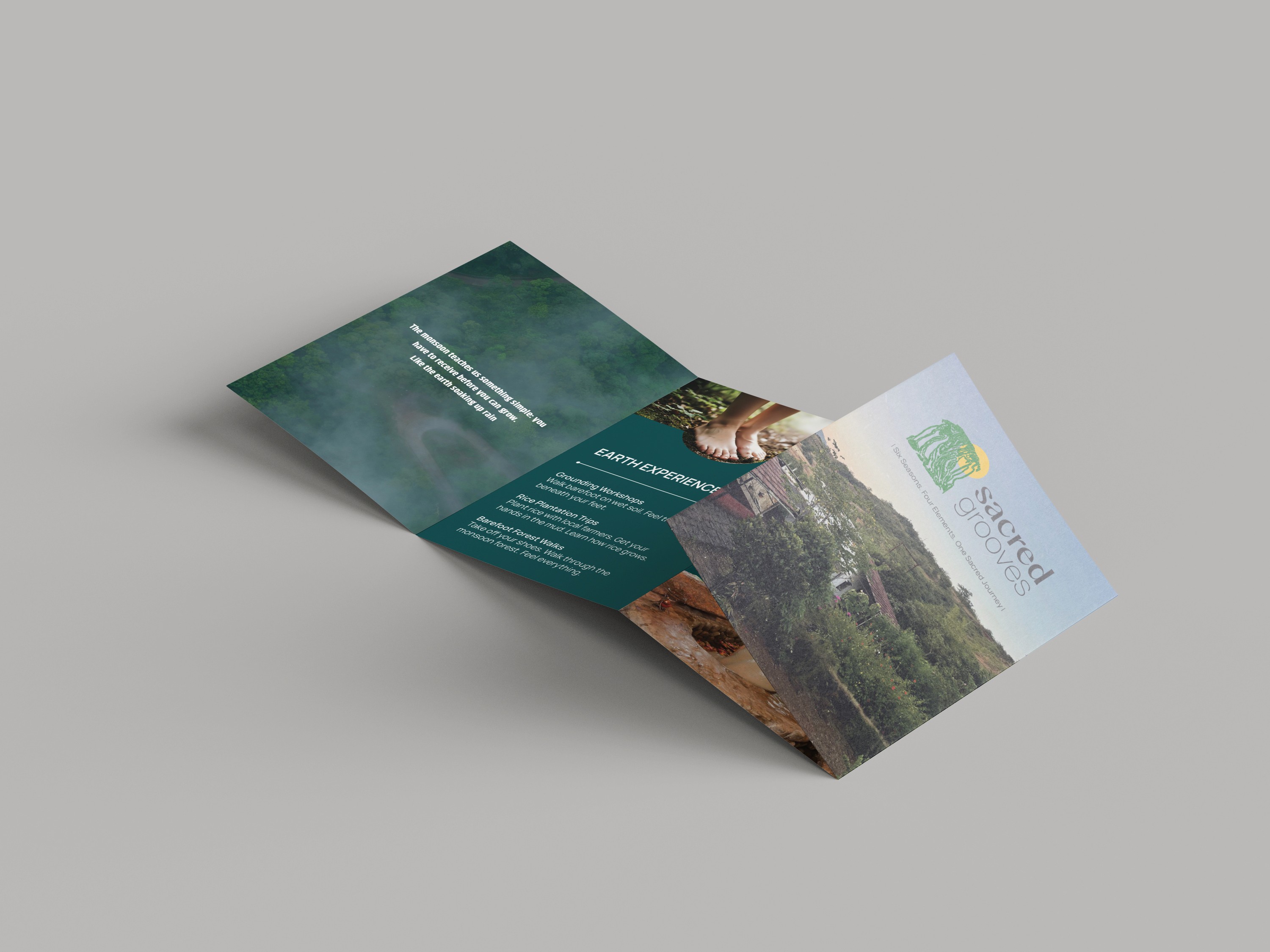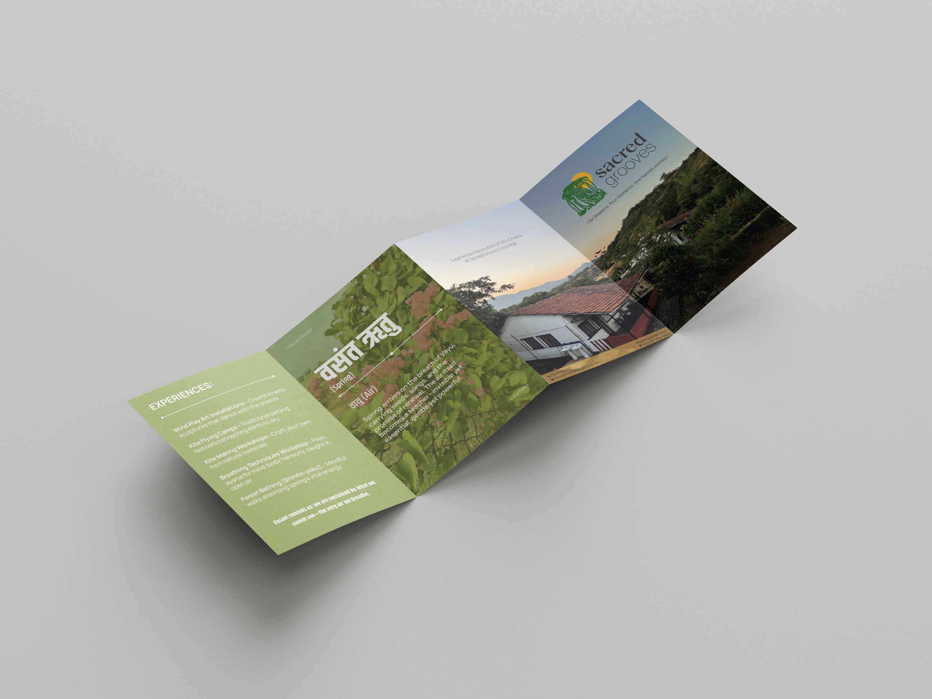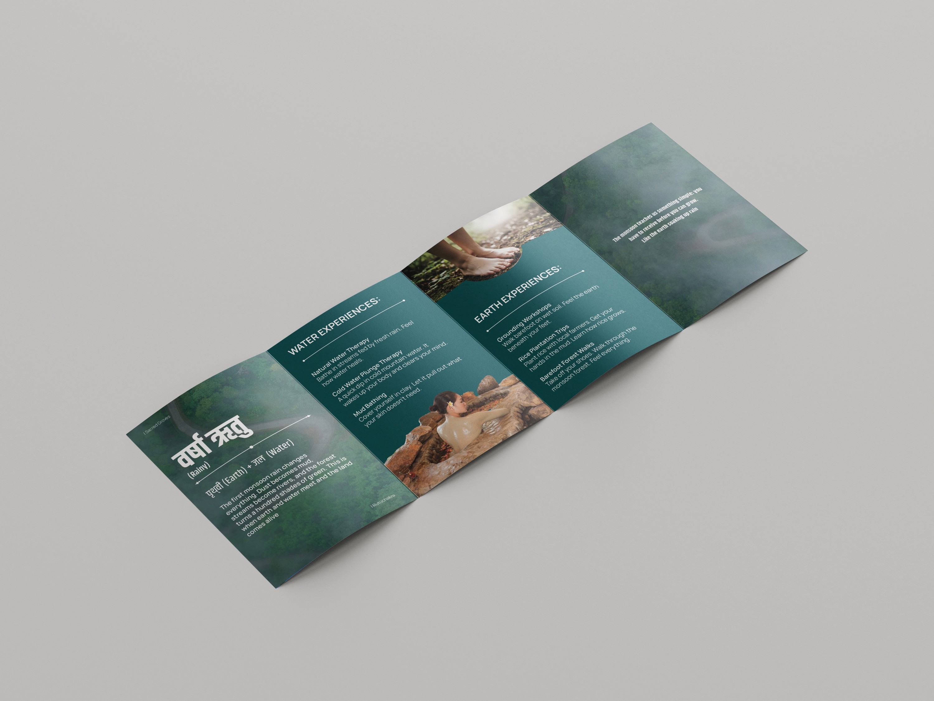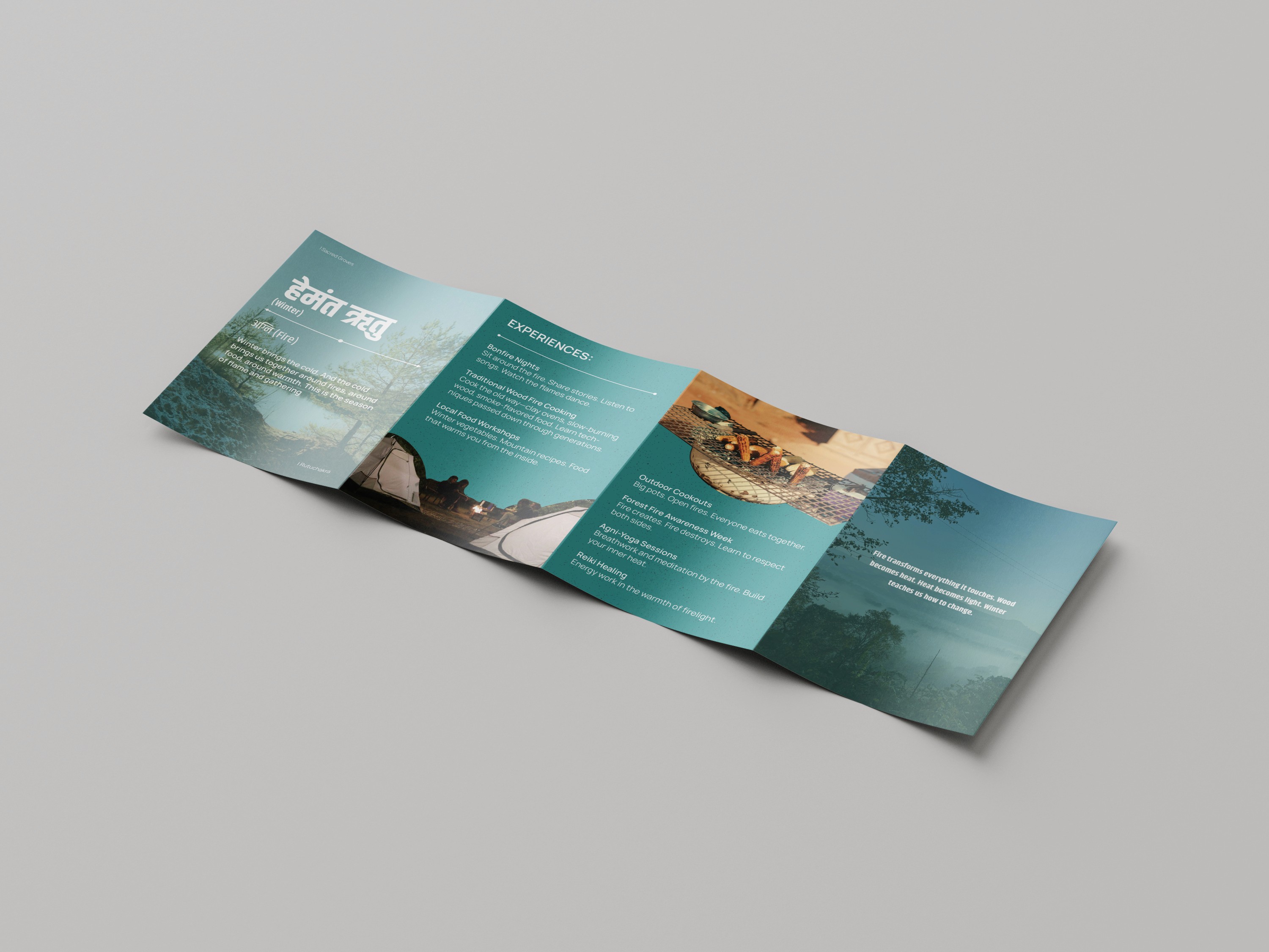 This zine explores Sacred Grooves (Ecolodge) philosophy of living in harmony with the Rutuchakra (Seasons) and the Panchamahabhuta (Elements) Each spread interprets a season through its dominant element, mood, and sensory quality, translating nature’s rhythms into visual storytelling. The project reflects how landscape, time, and emotion shift together, using color, imagery and composition to mirror the forest’s transformations. Designed as a tactile narrative, the zine positions design as an evolving seasonal experience.